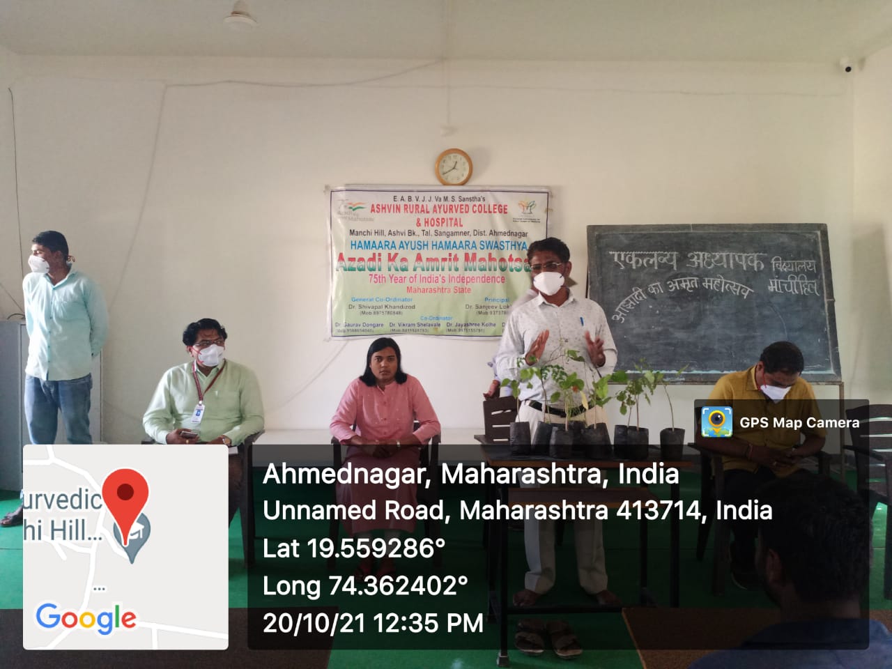 | 1.Faculty, UG & PG students actively participated in Medicinal Ayurvedic Plants Distrubustion in “Eklavya B.J.J Adhyapak Vidyalay” 2. Dr. Tushar Deshpande given information about medicinal Ayurvedic Plants uses for medicinal purpose. 3.Ug Students Identyfy Ayurvedic Plants & given imformation about plants uses in various disease to D. Ed college staff & students. 4. faculty, ug & pg students distributed ayurvedic plants to D. Ed college teacher staff & students. 5.Faculty Teacher Dr. Mr. Pravin kadu given vote for thanks to all attending participants. 6. End of program Dr Shivpal Khandizod giving thanks to all team for useful program. |